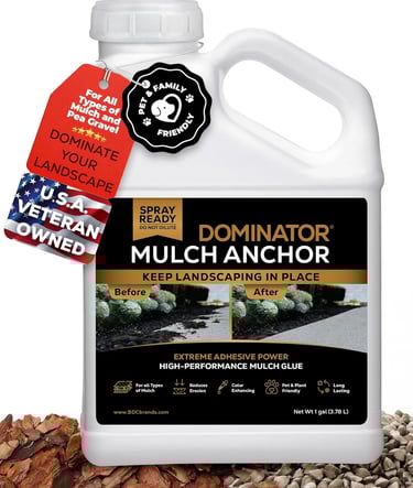Dominator Mulch Anchor delivers powerful hold for mulch, gravel, bark, and stones, keeping your landscaping clean and stable in all weather. This ready-to-use formula sprays easily, dries clear, and prevents washout or shifting—perfect for gardens, pathways, and decorative areas. Strong, long-lasting, and proudly made in the USA.