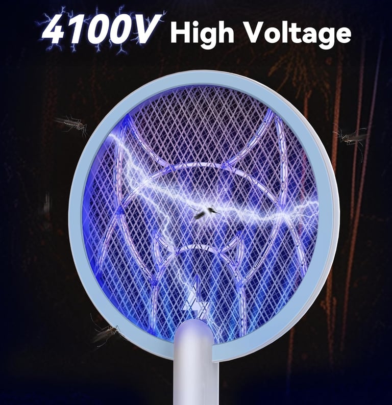 Eliminate mosquitoes instantly with this 4100V electric fly swatter racket! Featuring purple UV light attraction, a 3-layer safety mesh, and an 1800mAh rechargeable battery, it doubles as a handheld or standing bug zapper. Perfect for indoor and outdoor use — stay bite-free all summer long!