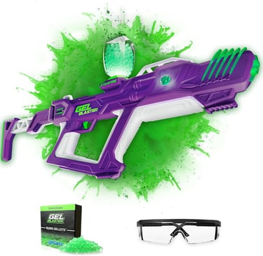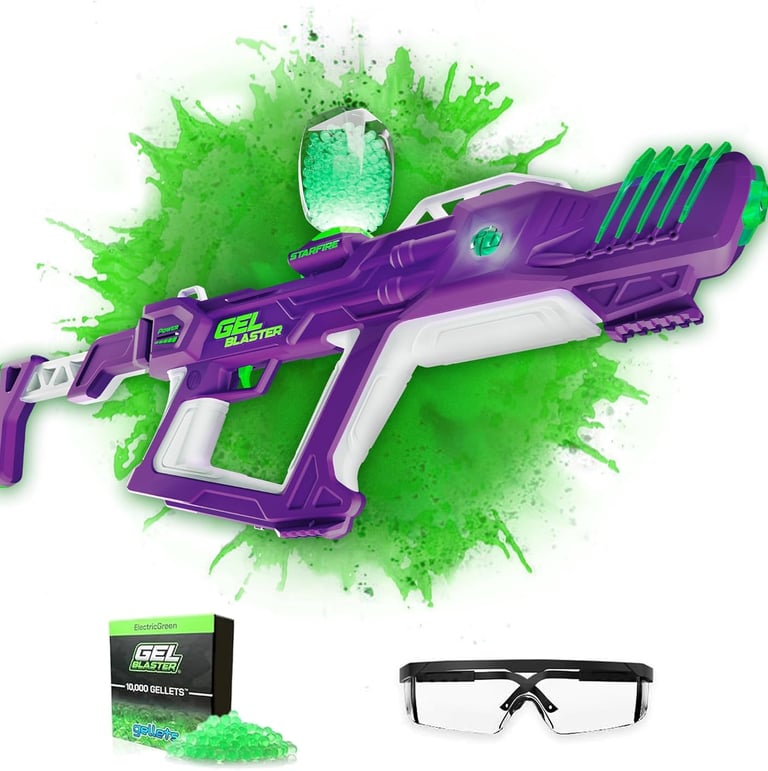 Dominate day and night battles with the Gel Blaster Starfire XL, the biggest and most powerful glow-in-the-dark gel blaster yet. Designed for ages 14+, it fires water-based Gellets up to 150 feet with adjustable FPS from 170 to 250, letting you tailor the intensity for any game. Switch seamlessly between Single, Triple Burst, and Full-Auto modes for fast-paced action. The included Starfire Activator charges glow-in-the-dark Gellets with UV light for an epic tracer effect at night. With a 1,000+ Gellet hopper and long-lasting rechargeable battery, the Starfire XL delivers nonstop outdoor fun without mess or cleanup.