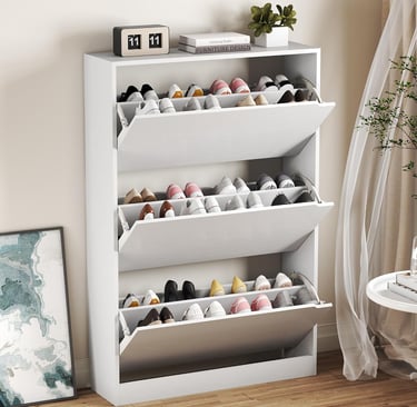 Keep your home neat and stylish with this 3-drawer hidden wooden shoe cabinet. Designed with a slim, freestanding frame, it fits perfectly in entryways or hallways without taking up space. The flip-drawer design keeps shoes organized and dust-free, while the white finish adds a clean, modern look to any interior.